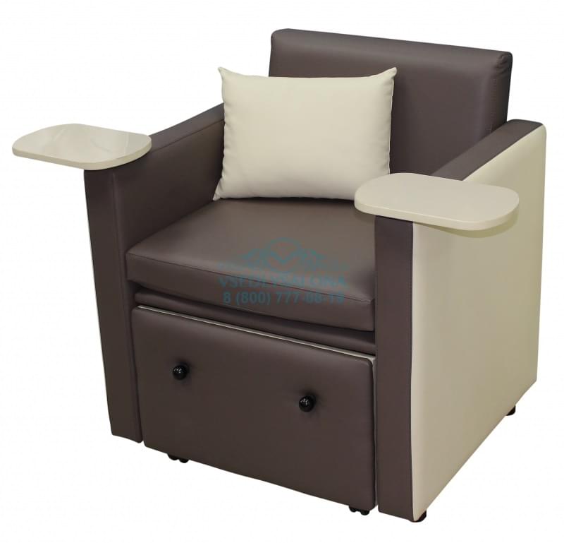 Бюджетным, но не менее красивым и многофункциональным может стать кресло российского производства. СПА кресло имеет крепкое металлическое основание, способное выдерживать большие нагрузки. Есть выдвижная нижняя часть, что является специальной удобной площадкой под ванночку. Обивка выполнена из нежно-бежевой и темно-коричневой прочной и надежной эко кожи. Для удобства клиентов в комплект входит подушка под спину и мягкие вставки в подлокотники с движущимися деревянными пластинами. Педикюрное СПА кресло станет идеальным дополнением вашего СПА салона.