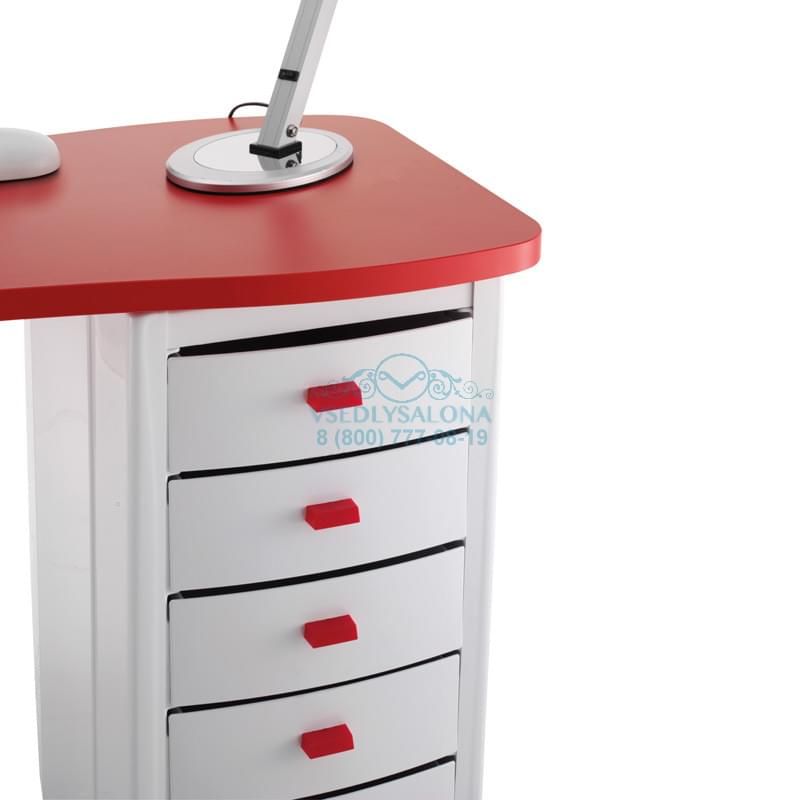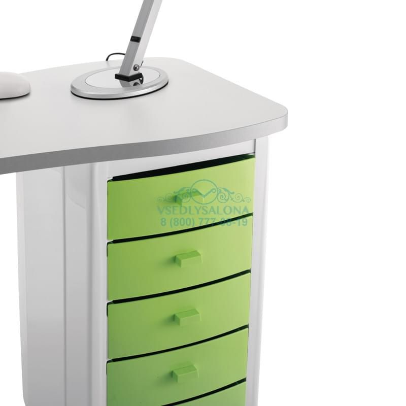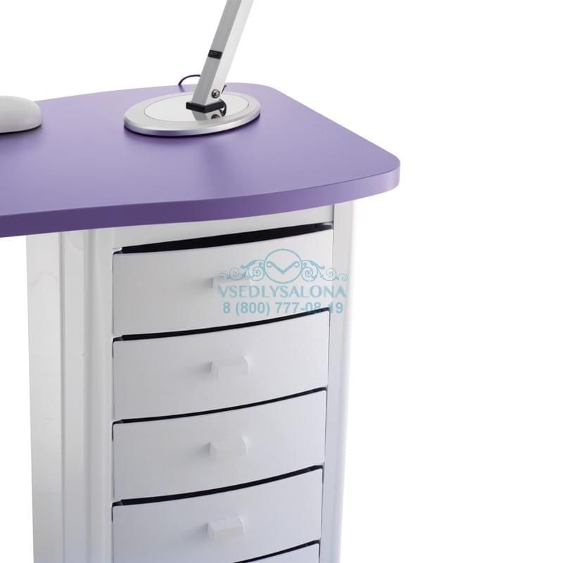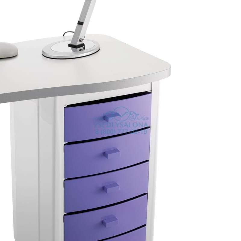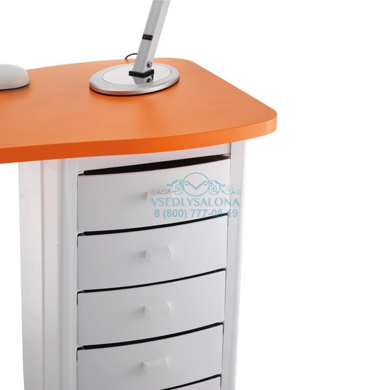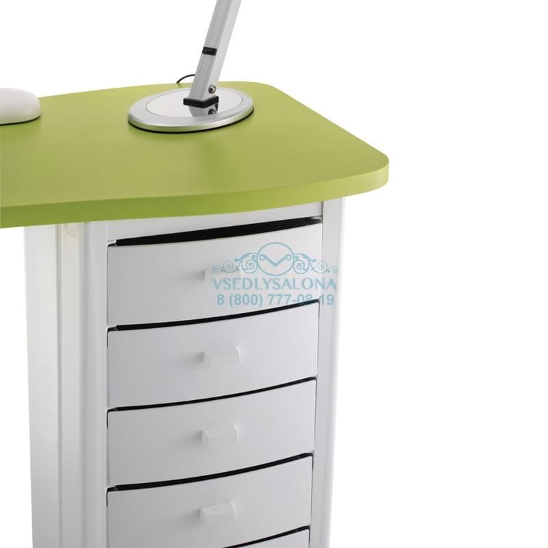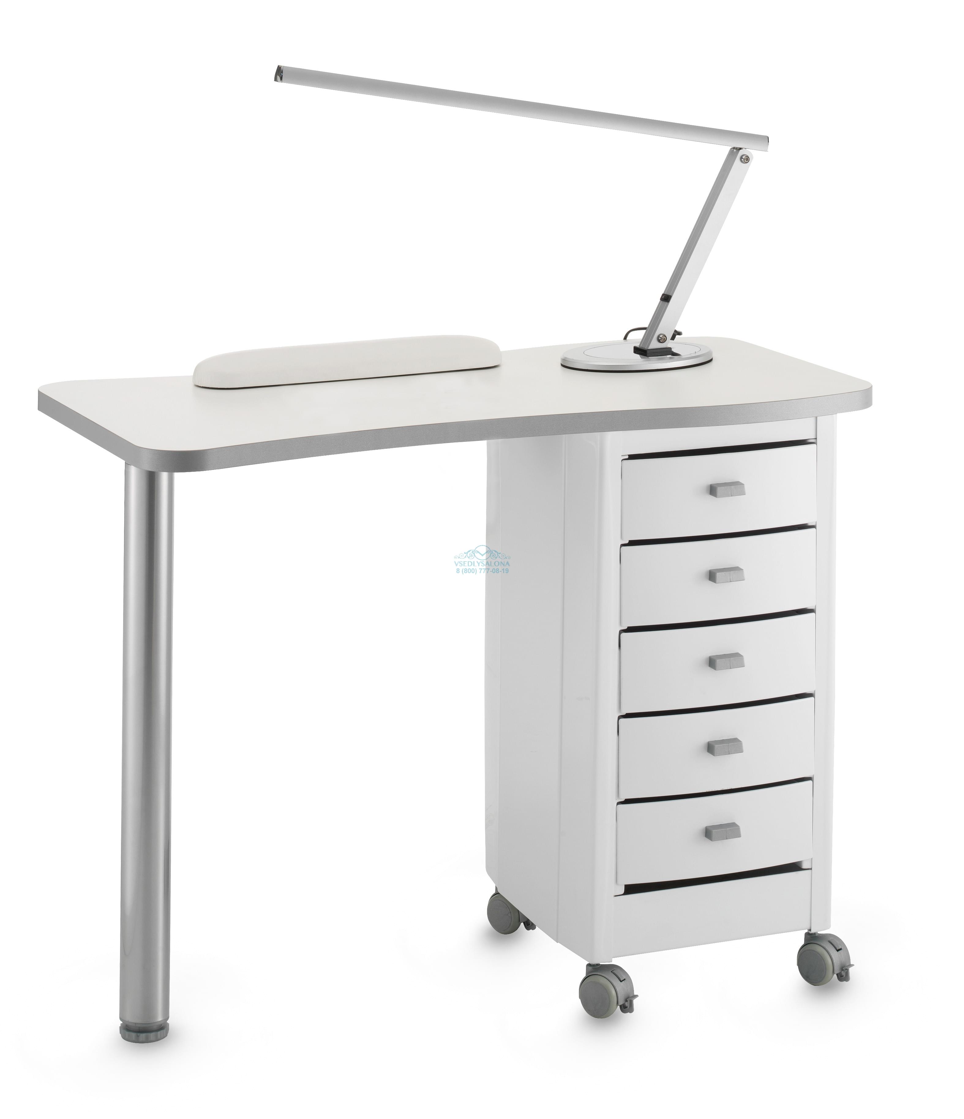 Маникюрный стол с одной тумбой, столешница ламинированная, тумба пластиковая с выдвижными ящиками, на колесах. В комплекте: лампа, подушка маникюрная, подставка под лаки.