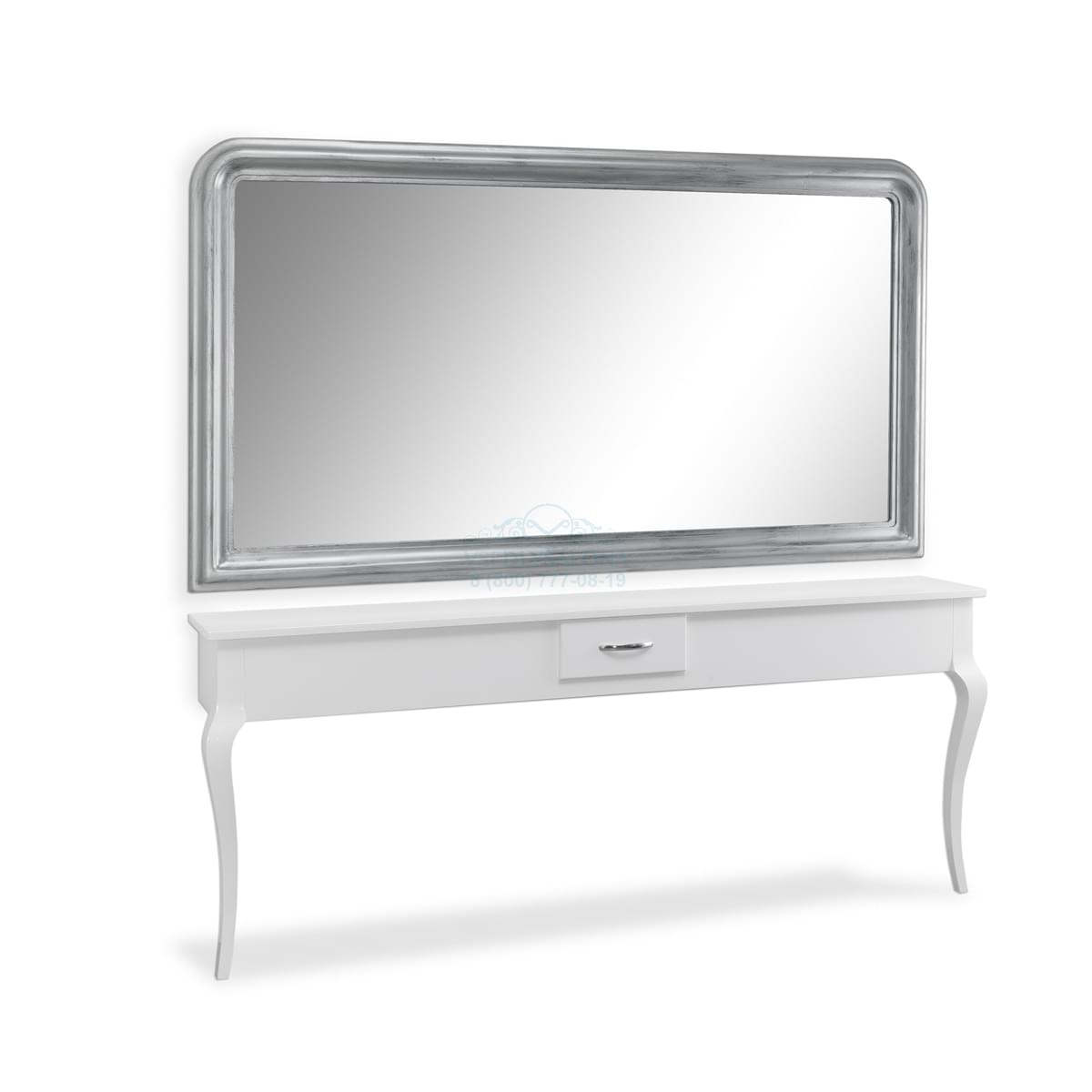 Двойное настенное рабочее место мастера, состоит из зеркала в золотой багетной раме и пристенного столика с двумя ножками, выполнено в лакированном дереве. Цвет дерева можно выбрать. Коллекция 2009 года. Размер:201x33x196