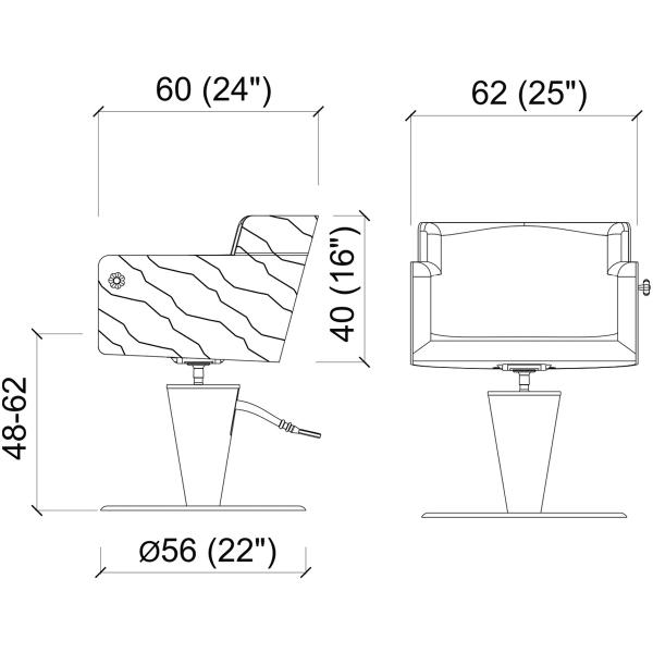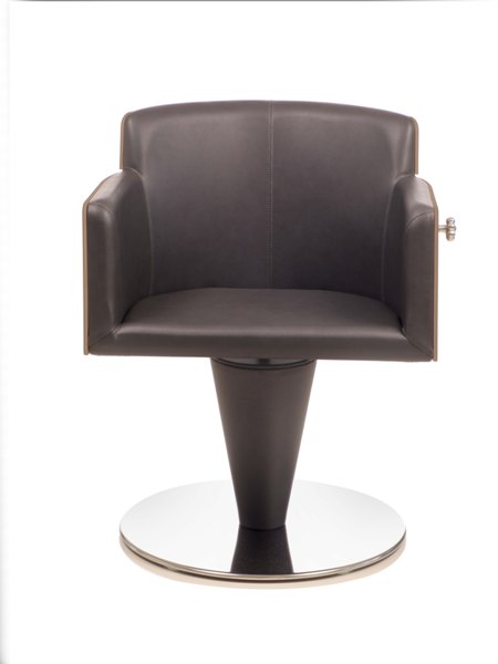 Дизайнерское парикмахерское кресло. Кресло для клиента комплектуется дисковым основанием из нержавеющей стали и гидроподъемником с блокировкой. Отделка каркаса кресла - ламинат "под дерево", отделка гидроподъемника - искусственная кожа. Кресло оснащено комфортными подлокотниками и декоративной ручкой для подвешивания сумок, обеспечивая клиенту максимальный комфорт. Обивка - искусственная кожа высшего качества.