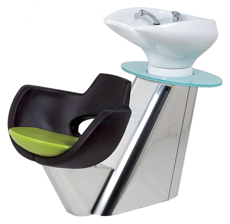 Мойка парикмахерская с креслом. Каркас мойки выполнен из хромированного металла, имеет округлую полку для шампуней из матового стекла. Комплектуется белой, черной или синей керамической раковиной. Кресло изготовлено из высококачественного поролона, обтянутого искусственной кожей высшего качества.