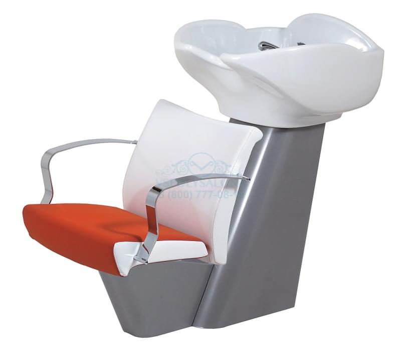 Мойка парикмахерская с креслом. Каркас мойки выполнен из металла серебристого цвета. Комплектуется белой, черной или синей керамической раковиной. Кресло изготовлено из высококачественного поролона, обтянутого искусственной кожей высшего качества. Подлокотники из хромированного металла или дерева цвета дуб или вишня.