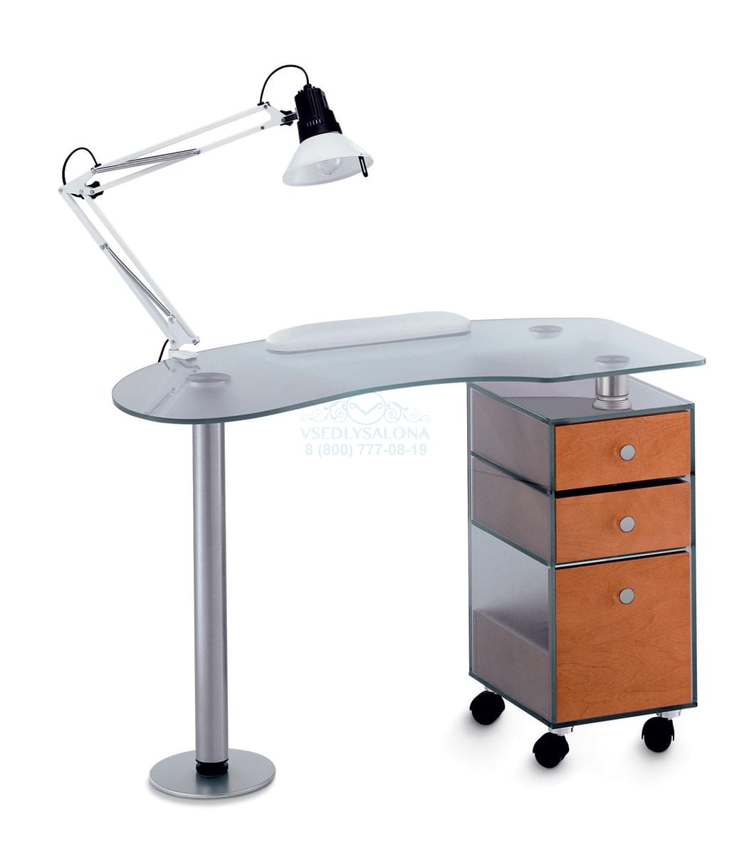 Маникюрный стол с одной тумбой и стеклянной столешницей. Тумба изготовлена из стекла, оснащена колесами и тремя выдвижными деревянными ящиками цвета венге или вишня. В комплекте: лампа, подушка для маникюра, подставка для лаков. Размер: 110x55x72