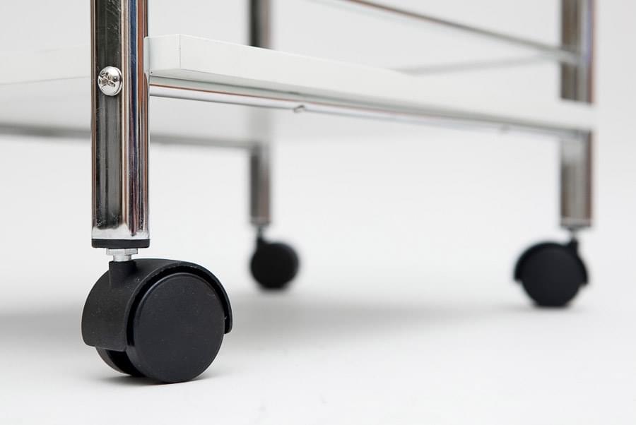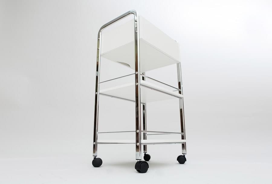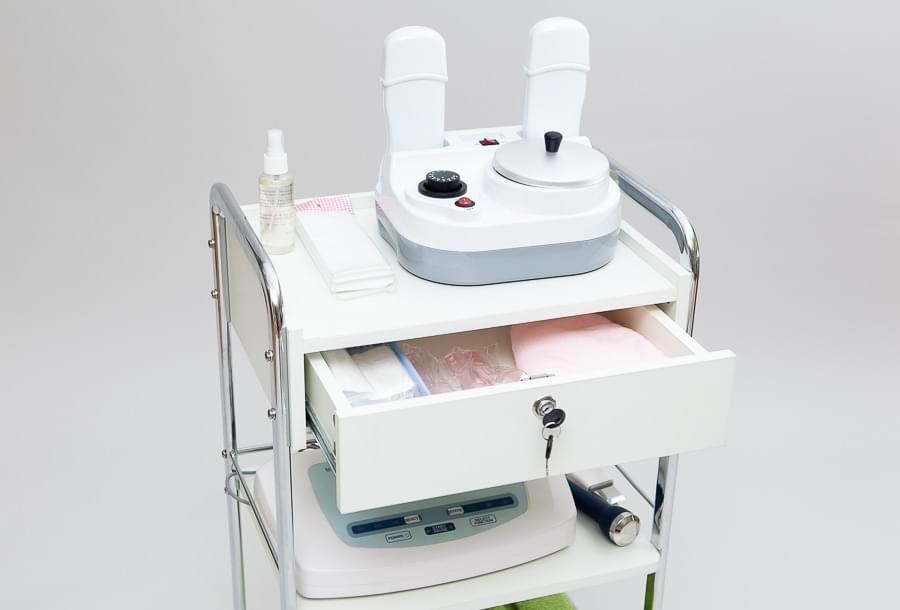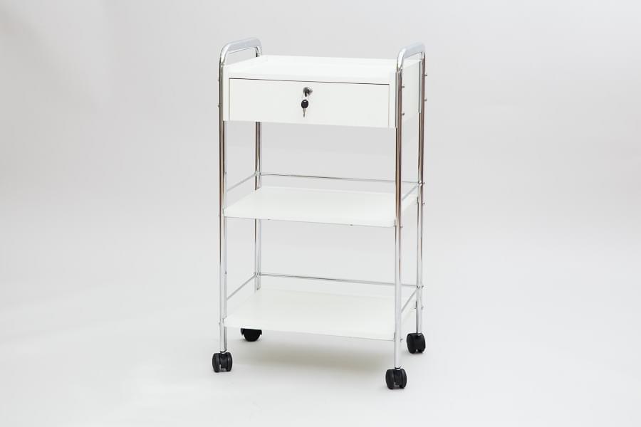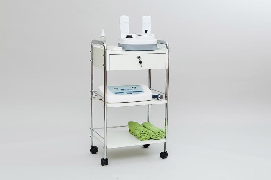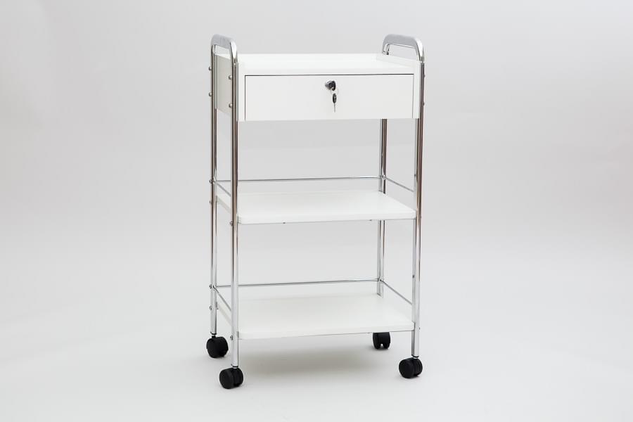 Тележка косметолога SD-938A предназначена для рационального обустройства пространства кабинетов и салонов красоты. Изделие изготовлено из ЛДСП и основанием из хромированной стали. Три вместительных полки позволяют разместить необходимые для работы инструменты и оборудование. Верхний выдвижной ящик имеет замок с ключом.