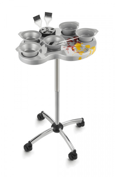 Тележка для окрашивания "PALETTE COLOR SPLASH" - тележка с артикулом A-м60003006 из пластика на колесах. Имеет 5 отделений под миски для окрашивания, 5 отделений под кисти и отделение для сопутствующих аксессуаров. Отличительной особенностью тележки является наличие декортаивного рисунка в виде кляксы.