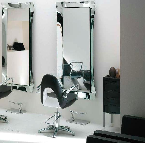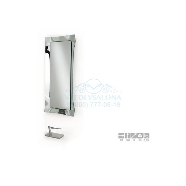 Зеркало парикмахерское в оригинальном исполнении рамы изогнутой легкой волной, выполненной из полированной зеркальной стали, черного или белого стекла. Зеркало крепится к стене. Размер (ДхШхВ): 74х11х168,