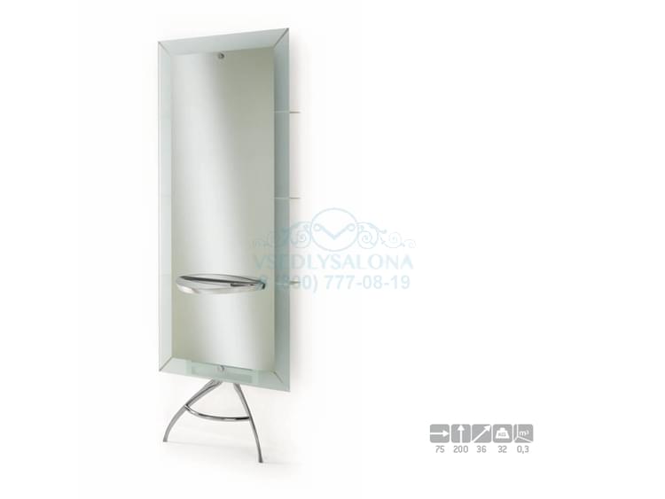 Зеркало парикмахерское прямоугольной формы по краям матированное стекло, комплектуется столешницей овальной или квадратной формы из полированного алюминия с отверстием для фена, подставкой под ноги, сзади находятся дополнительные полки. Зеркало крепится к стене. Возможен вариант с подсветкой.